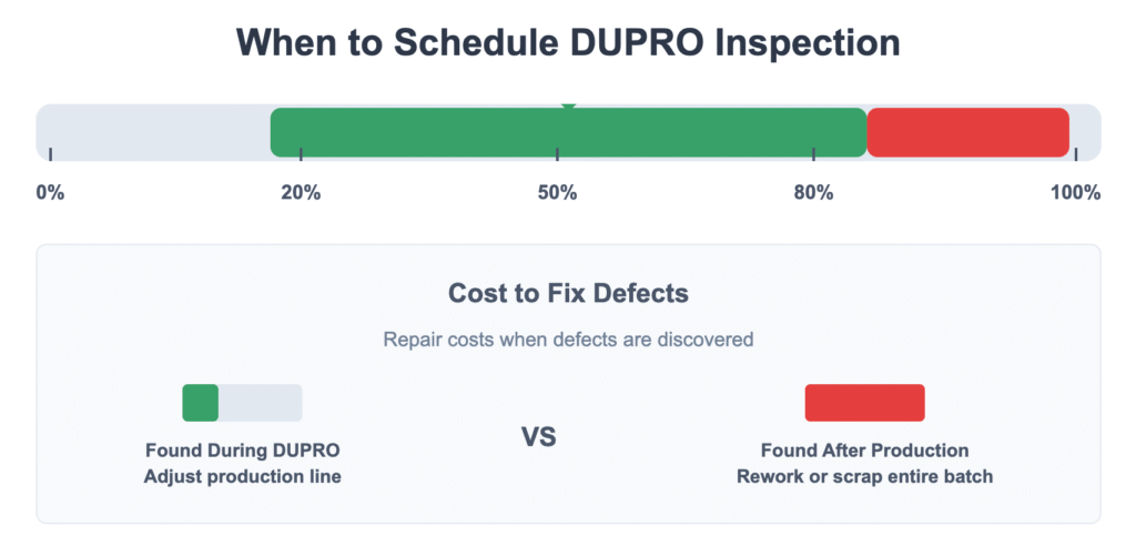 A During Production Inspection (DUPRO) also called In-Process Inspection, IPQC, or Inline Quality Inspection is performed when 20–80% of an order is complete. Instead of waiting until production finishes, we inspect while goods are still being made, catching problems when they’re fast and affordable to fix.